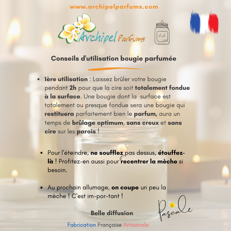Pour tout savoir sur la bonne utilisation de votre bougie, pour pouvoir en profiter le plus longtemps possible ... je vous ai rédigé un article de blog + un petit ebook à télécharger : "Comment bien utiliser et profiter de ma bougie parfumée".