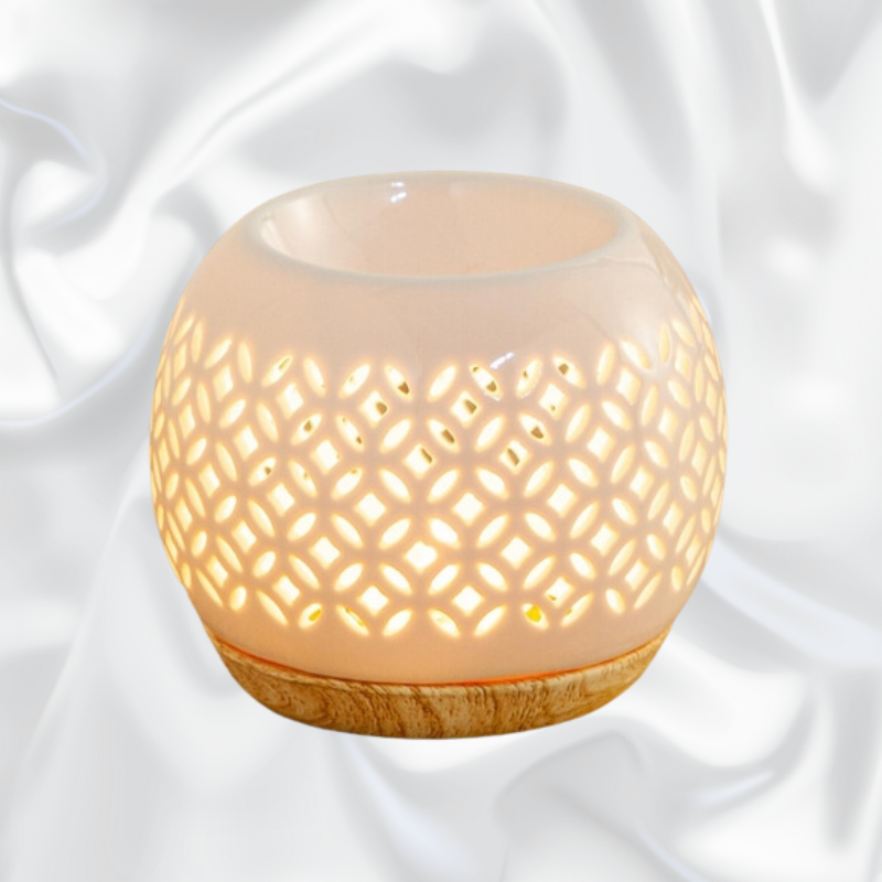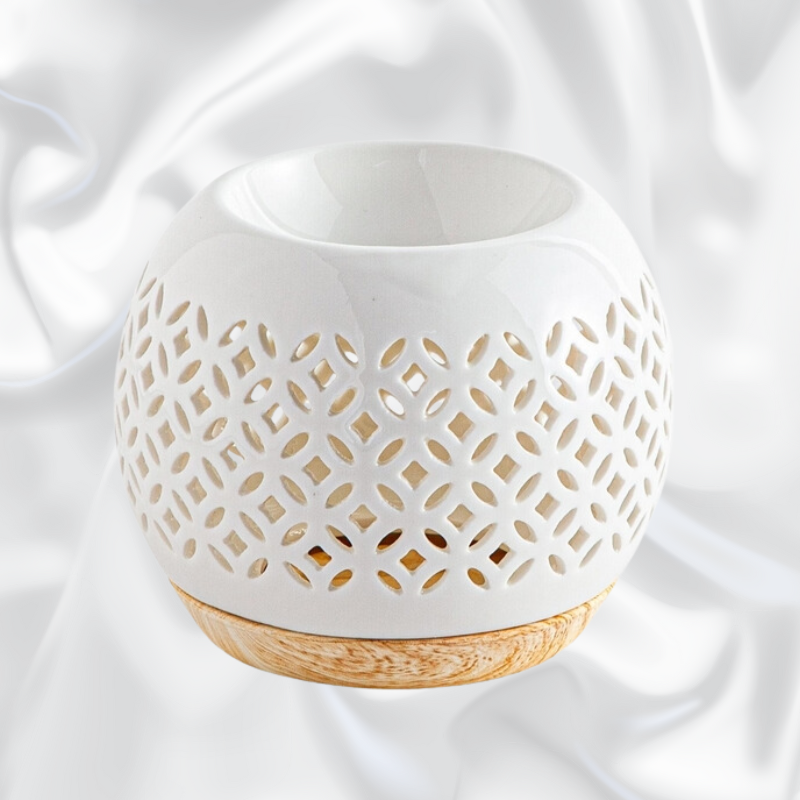 Ce joli brûle-parfum pour bougie, d'inspiration asiatique et exotique mêle la douceur du bois et l'éclat blanc de la céramique.